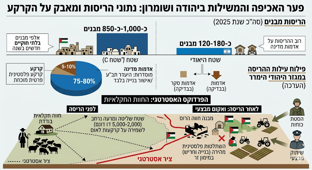 האכיפה אינה נובעת מגזל קרקע של פלסטיני (שכן אין הוכחת בעלות כזו ברוב המוחלט של המקרים), אלא מבירוקרטיה פנימית של המנהל האזרחי. המדינה, למעשה, הורסת לעצמה את נכסיה האסטרטגיים בשם פורמליזם משפטי יבש, בעוד שבמרחק מאות מטרים נבנים אלפי מבנים פלסטיניים ללא הפרעה.